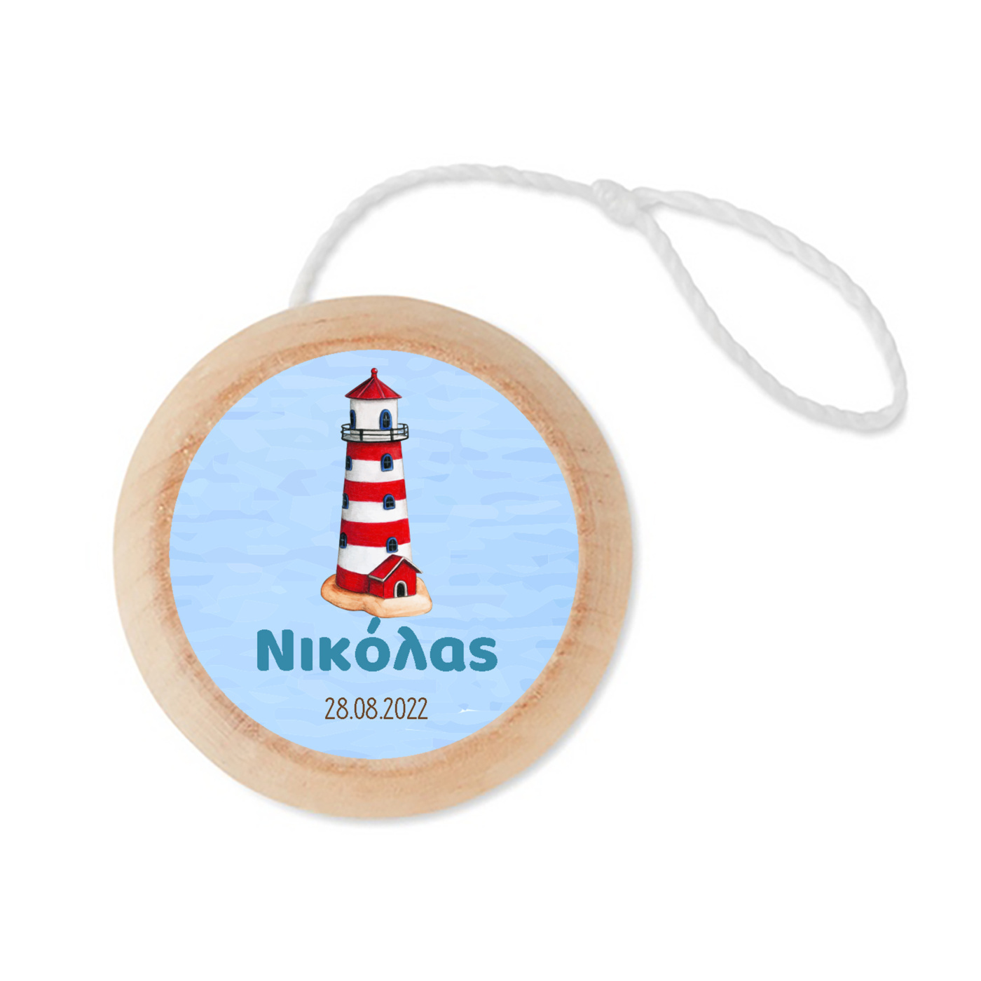 Γιο-Γιο από Ξύλο Ναυτικό με το όνομα του παιδιού με αυτοκόλλητο και στις δύο πλευρές κατάλληλο για δωράκι η μπομπονιέρα βάπτισης.