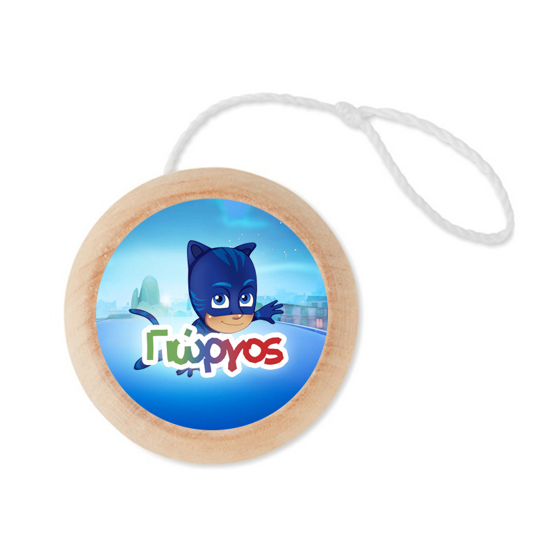 Γιο-Γιο από Ξύλο PJ Masks με το όνομα του παιδιού με αυτοκόλλητο και στις δύο πλευρές κατάλληλο για δωράκι η μπομπονιέρα βάπτισης.