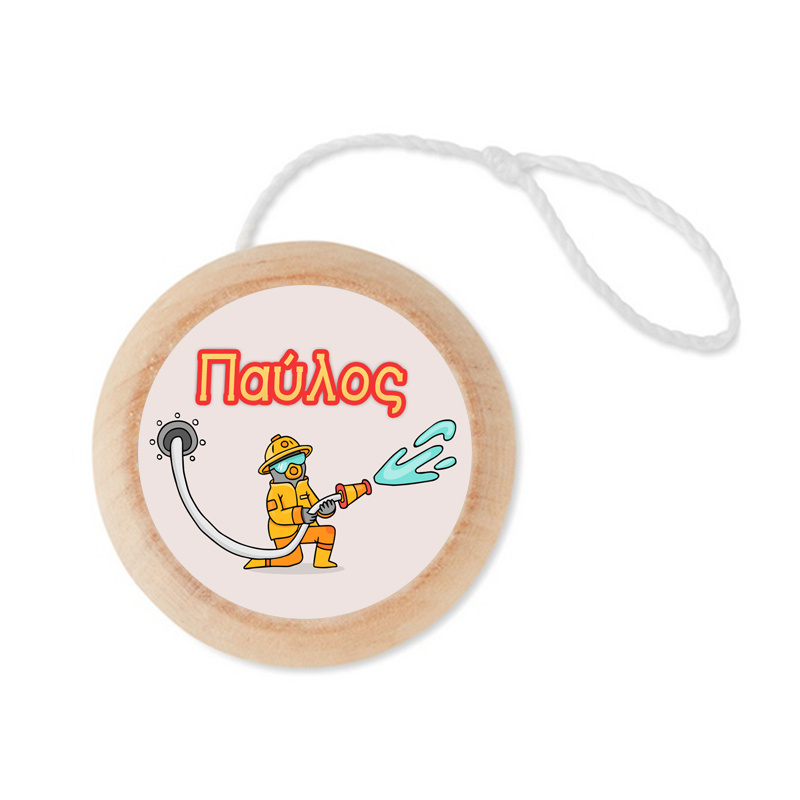 Γιο-Γιο από Ξύλο Πυροσβεστική με το όνομα του παιδιού με αυτοκόλλητο και στις δύο πλευρές κατάλληλο για δωράκι η μπομπονιέρα βάπτισης.