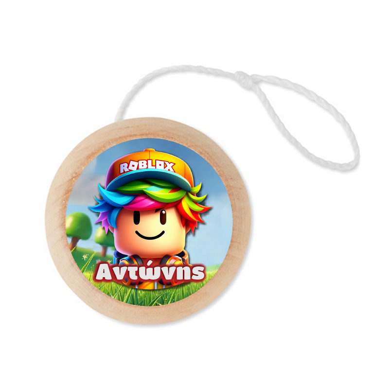 Γιο-Γιο από Ξύλο Roblox με το όνομα του παιδιού με αυτοκόλλητο και στις δύο πλευρές κατάλληλο για δωράκι η μπομπονιέρα βάπτισης.