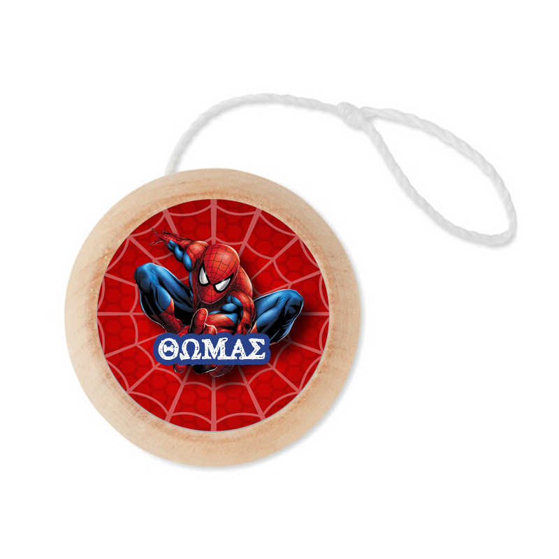 Γιο-Γιο από Ξύλο Spiderman με το όνομα του παιδιού με αυτοκόλλητο και στις δύο πλευρές κατάλληλο για δωράκι η μπομπονιέρα βάπτισης.