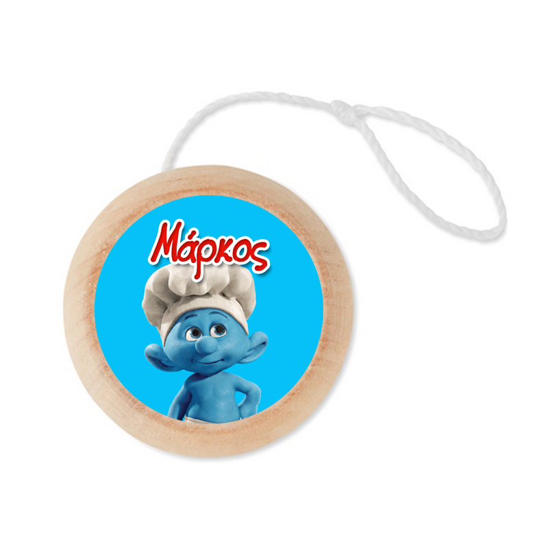 Γιο-Γιο από Ξύλο Στρουμφάκια με το όνομα του παιδιού με αυτοκόλλητο και στις δύο πλευρές κατάλληλο για δωράκι η μπομπονιέρα βάπτισης.