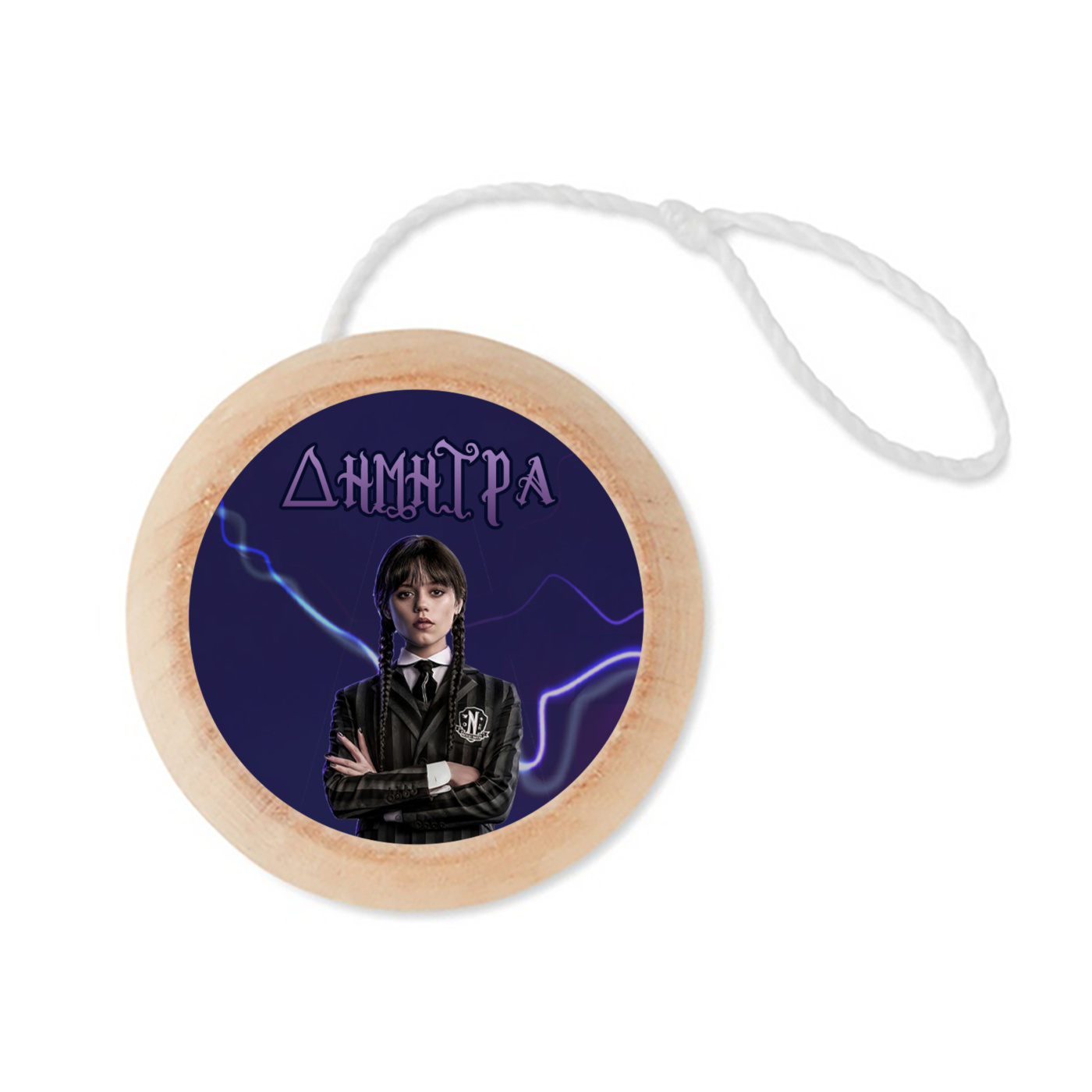 Γιο-Γιο από Ξύλο Wednesday με το όνομα του παιδιού με αυτοκόλλητο και στις δύο πλευρές κατάλληλο για δωράκι η μπομπονιέρα βάπτισης.