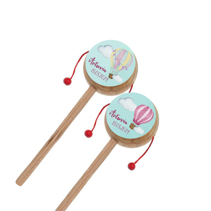 Ξύλινο natural τυμπανάκι με αυτοκόλλητο Αερόστατο και το όνομα του παιδιού σας.