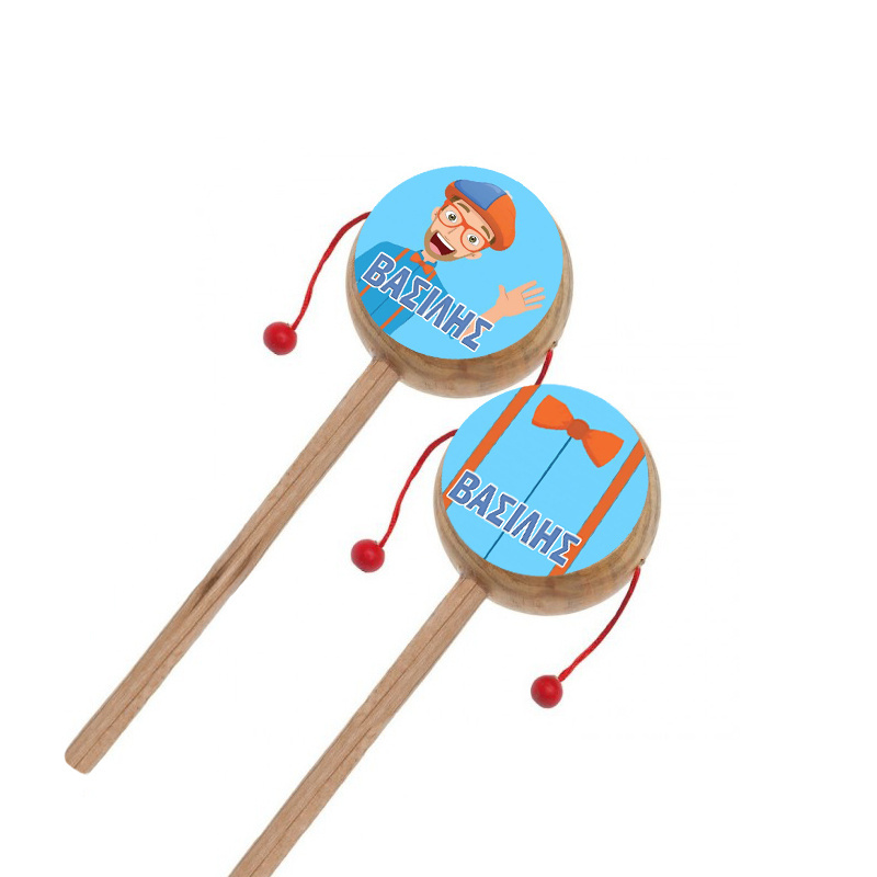 Ξύλινο natural τυμπανάκι με αυτοκόλλητο Blippi και το όνομα του παιδιού σας.