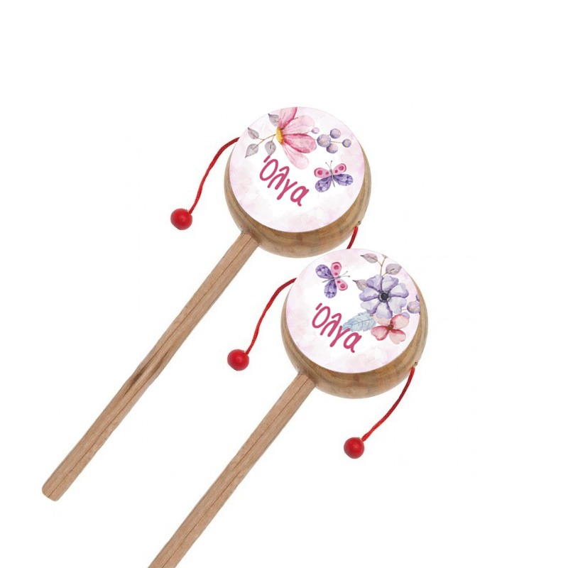 Ξύλινο natural τυμπανάκι με αυτοκόλλητο Butterfly και το όνομα του παιδιού σας.