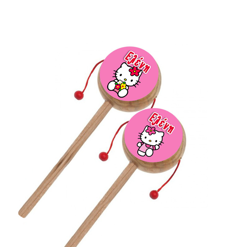 Ξύλινο natural τυμπανάκι με αυτοκόλλητο Hello Kitty και το όνομα του παιδιού σας.