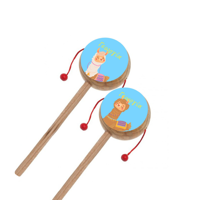 Ξύλινο natural τυμπανάκι με αυτοκόλλητο Λάμα και το όνομα του παιδιού σας.