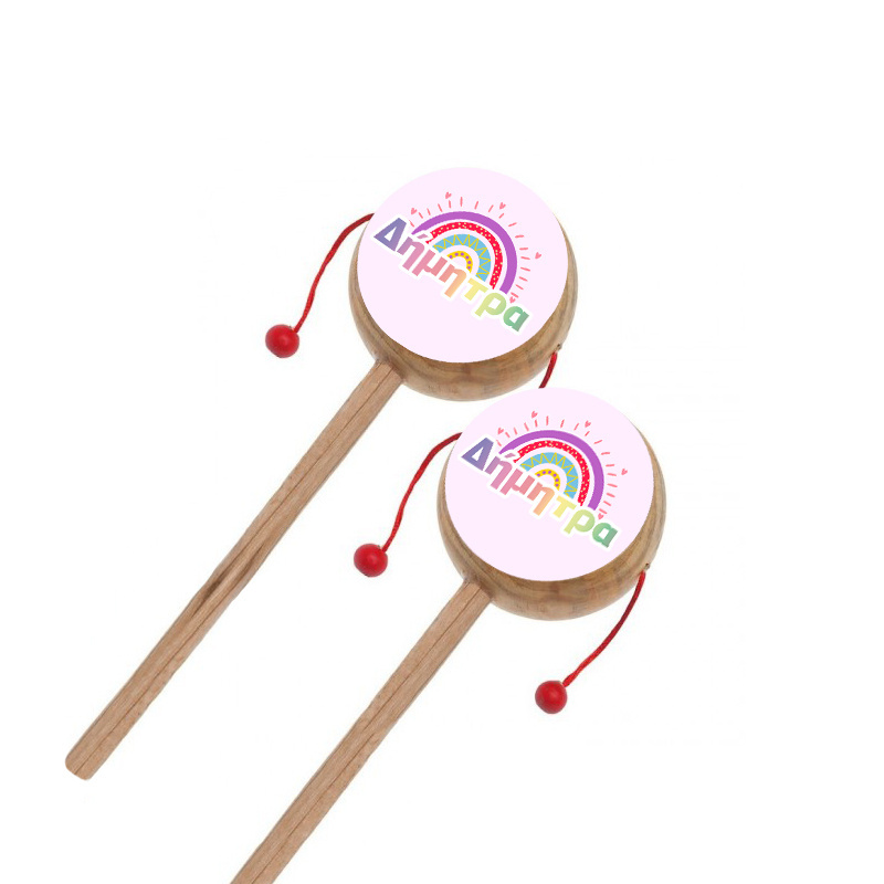 Ξύλινο natural τυμπανάκι με αυτοκόλλητο Retro Rainbow και το όνομα του παιδιού σας.