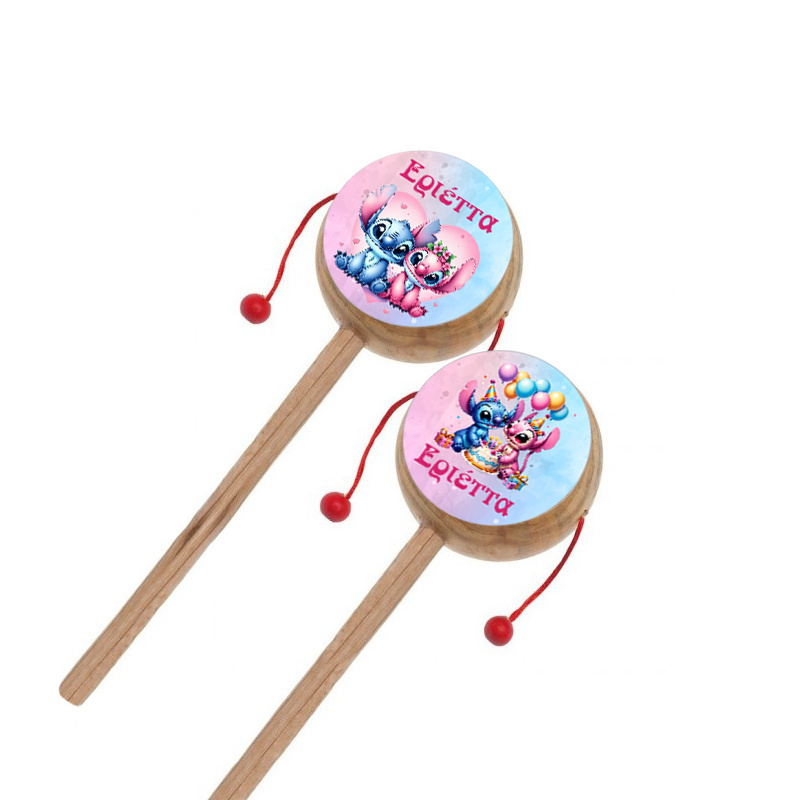 Ξύλινο natural τυμπανάκι με αυτοκόλλητο Stitch & Angel και το όνομα του παιδιού σας.