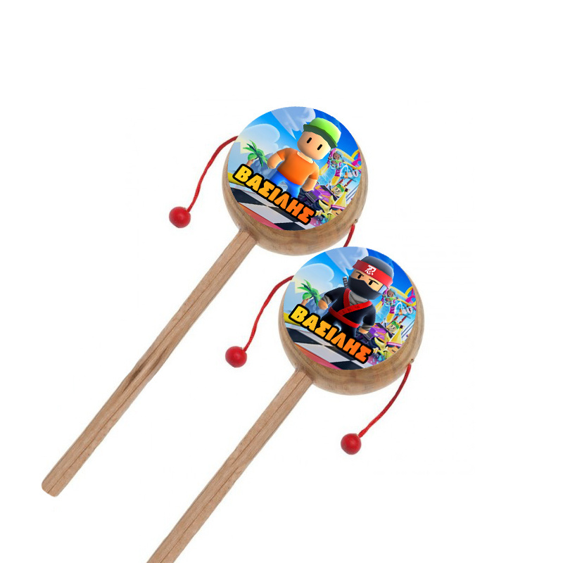Ξύλινο natural τυμπανάκι με αυτοκόλλητο Stumble Guys και το όνομα του παιδιού σας.