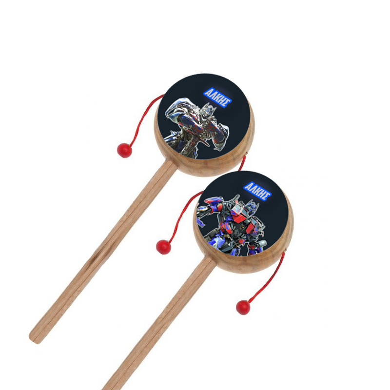Ξύλινο natural τυμπανάκι με αυτοκόλλητο Transformers και το όνομα του παιδιού σας.