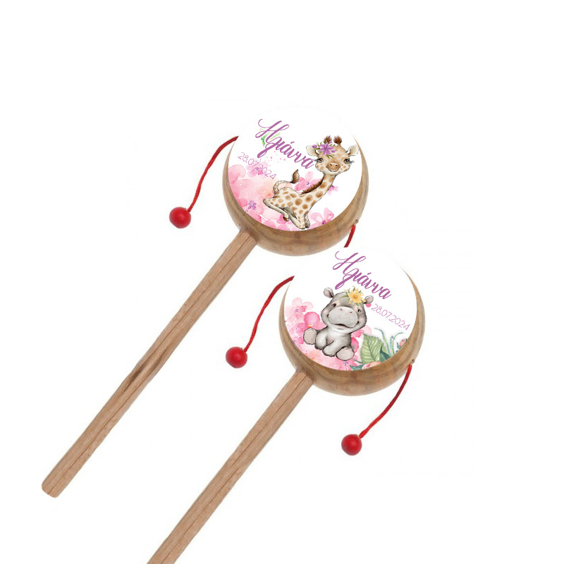 Ξύλινο natural τυμπανάκι με αυτοκόλλητο Ζωάκια ζούγκλας Κορίτσι και το όνομα του παιδιού σας.
