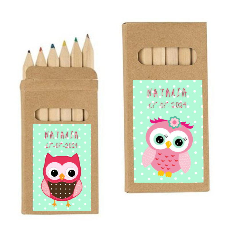 Σετ Ξυλομπογιές 6τμχ Κουκουβάγιες με όνομα ένα υπέροχο δωράκι για τους μικρούς μας φίλους. Για την Βάπτιση και το Πάρτι σας.