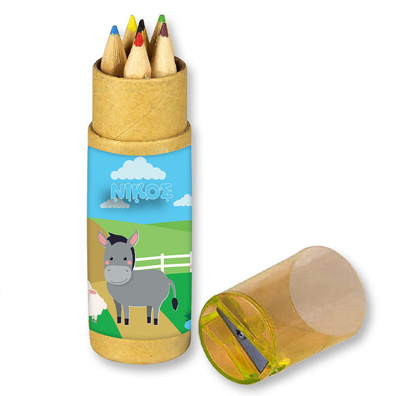 Σετ Ξυλομπογιές 6τμχ με ξύστρα Ζωάκια Φάρμας με όνομα ένα υπέροχο δωράκι για τους μικρούς μας φίλους. Για την Βάπτιση και το Πάρτι σας.